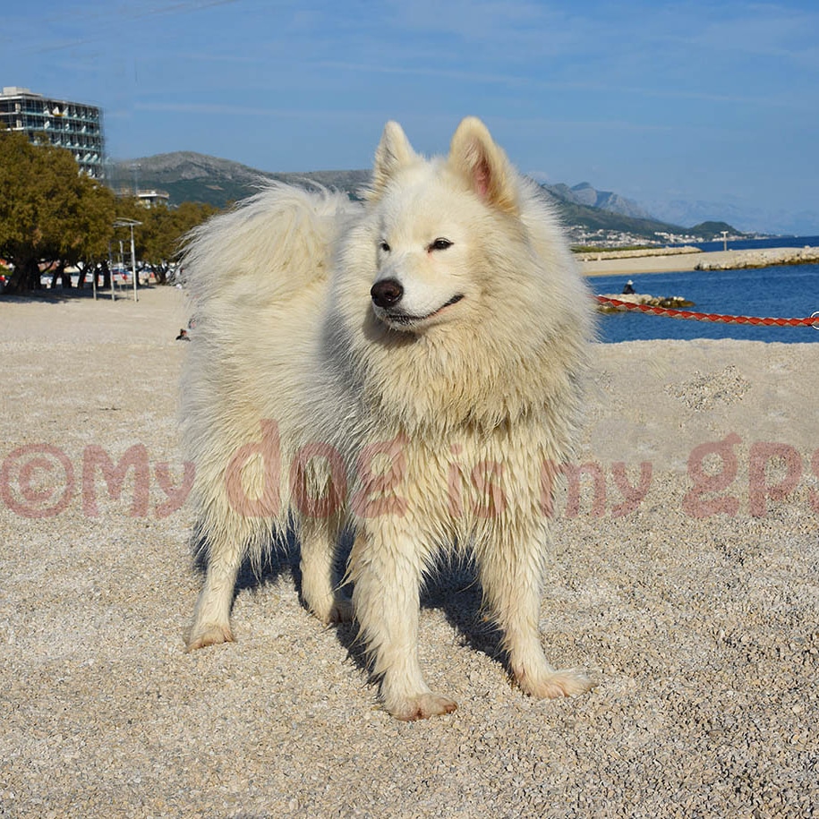 En Split en la playa estaba Aria, samoyedo de 3 años, que sonreía a todo el que pasaba.